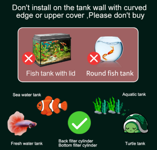 민물수조, 해수수족관, 수족관, 역여과수조, 바닥여과수조, 거북수조. 상단 덮개가 있는 어항으로 원형 어항에는 적합하지 않습니다.